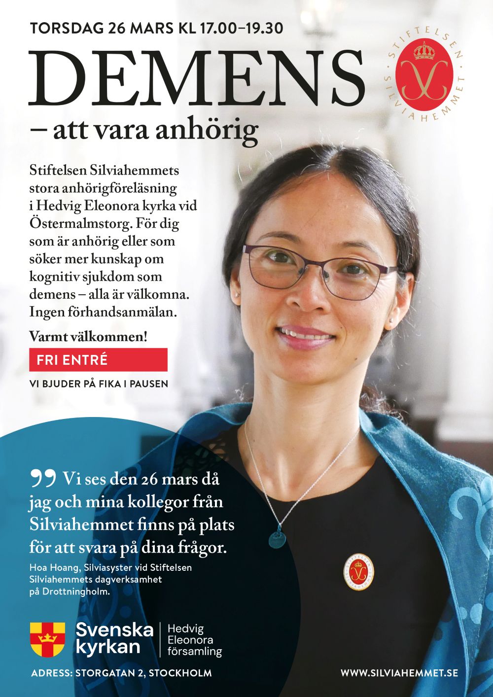 Stiftelsen Silviahemmets öppna och avgiftsfria föreläsning riktar sig till anhöriga, närstående eller till den som vill veta mer om kognitiv sjukdom som demens. Alla är välkomna! Föreläsare är Silviahemmets medarbetare med specialistkompetens inom demensområdet. De ger även svar på några av alla frågor som anhöriga har.